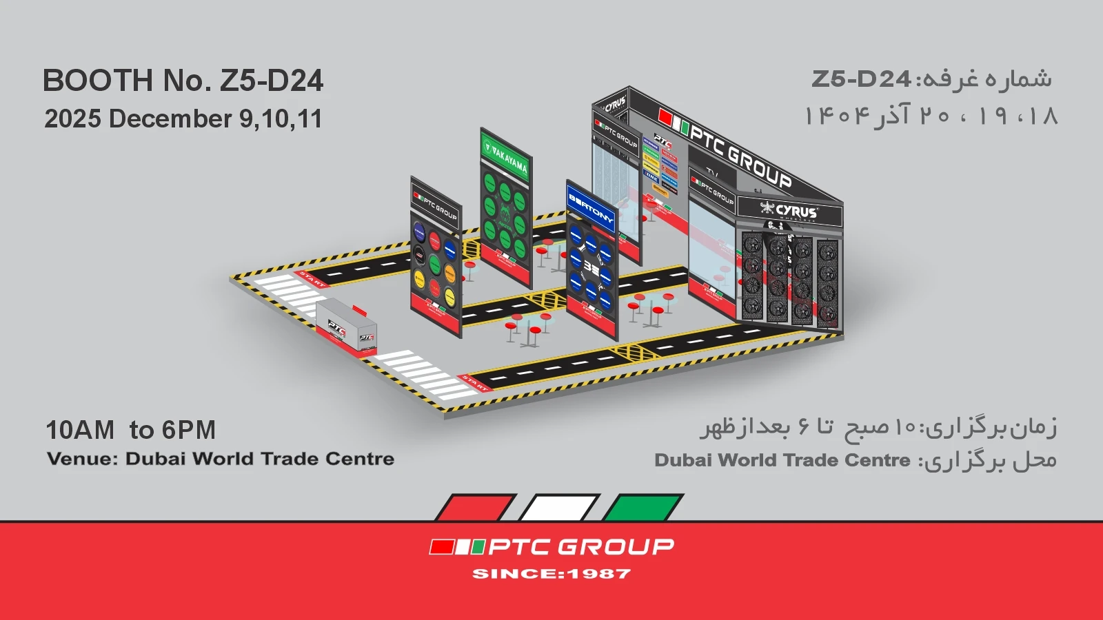 تایرزون به عنوان نماینده هلدینگ PTC GROUP از شما همکاران گرامی دعوت میکند از غرفه هلدینگ پی تی سی گروپ در نمایشگاه بین المللی اتومکانیکا دبی 2025 بازدید نمایید.